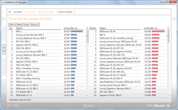 Our framework is based on a Data Analytics tool (e.g. Bissantz DeltaMaster) and a pre-configured Travel industry ruleset, so implementation time is a question of hours and not weeks. DeltaMaster triggers signals based on universal standards for reports and analyses. These signals communicate variances and management information faster and clearer than ever before.
